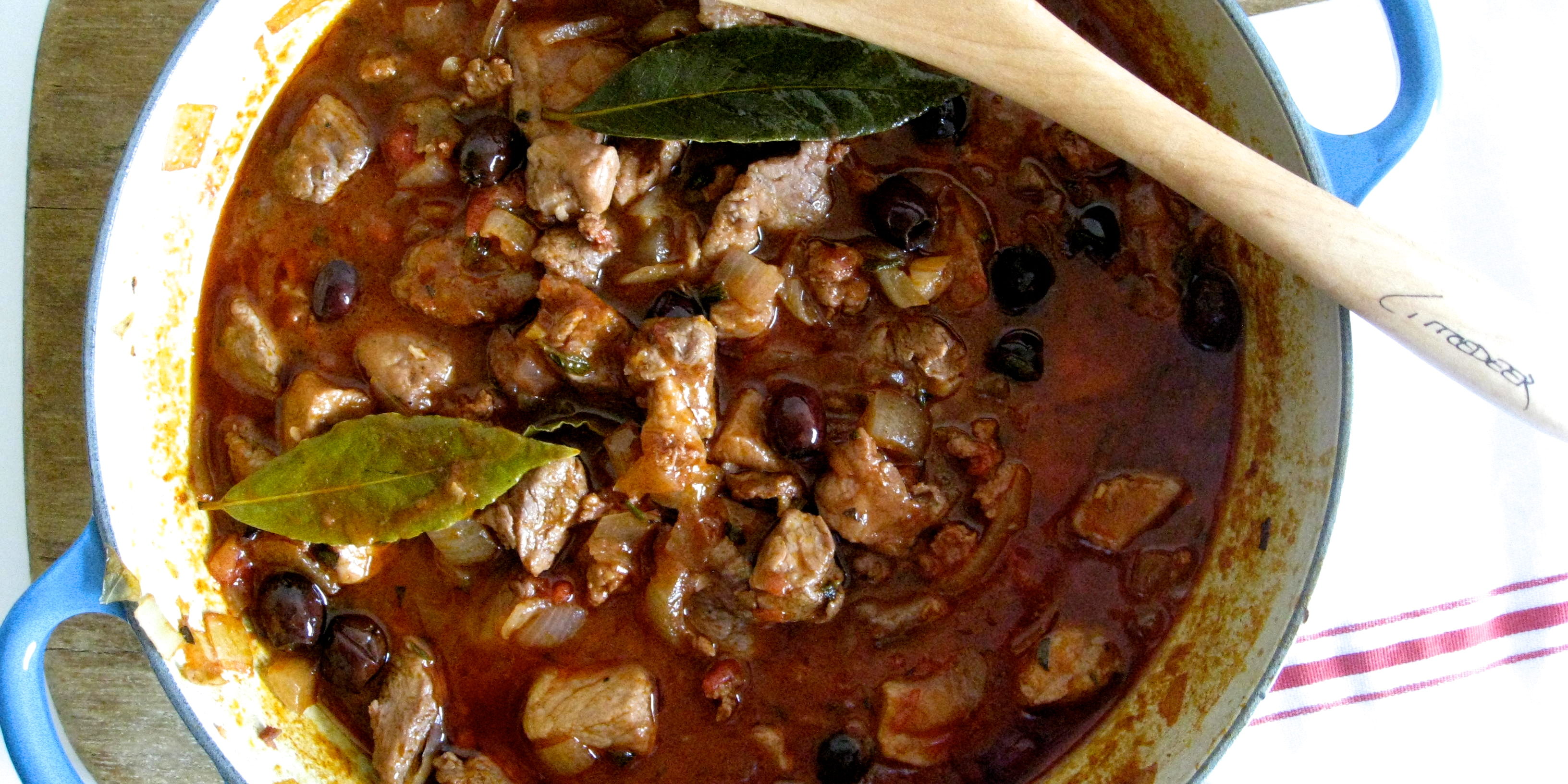 Del de grønne olivenene og bland den varsomt inn i grytas innhold.
